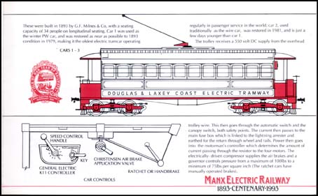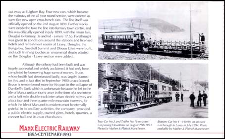 Back page of 1st interleaf Black and white pictures of car No. 3 and trailer No. 16 passing Howstrake, 1893 (top), car No. 4 running through Laxey, 1894 (bottom), and continuation of historical notes Click on the page to enlarge it |