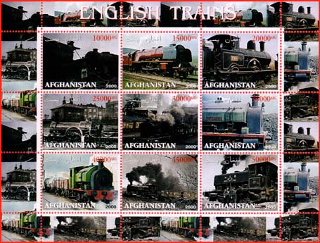 English trains Sheetlet of 9 stamps (considered illegal by UPU) Issue date: 2000 |