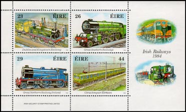 150th anniversary of first Irish railway Set of 4 stamps + miniature sheet of 4 stamps Issue date: 30th January 1984 |