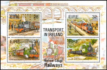 | Miniature sheet with all four above stamps; border with steam locomotive, passenger and freight cars on railway viaduct, and steam locomotive and cars, entitled "Transport in Ireland - Narrow Gauge Railways | |