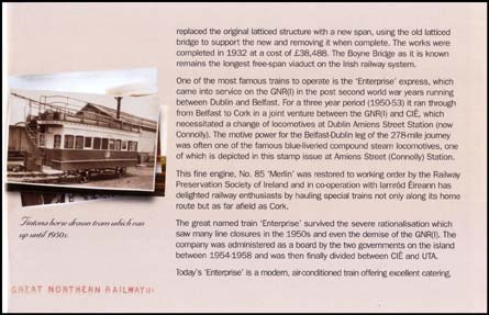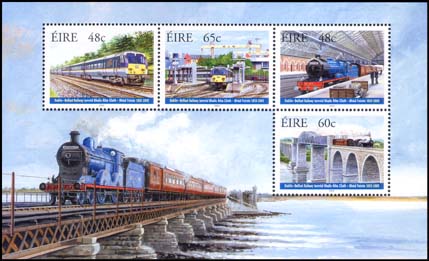 The border of minisheet features a morning southbound Enterprise train crossing the low viaduct near Malahide, Co. Dublin. At the head of the train is S Class 4-4-0 steam locomotive no. 170, “Errigal”. Paired with the engine is a D1 type 3500 gallon tender |