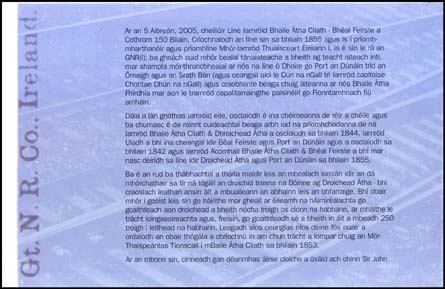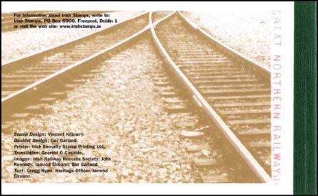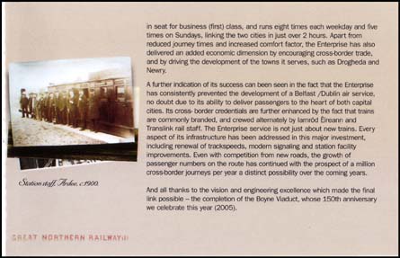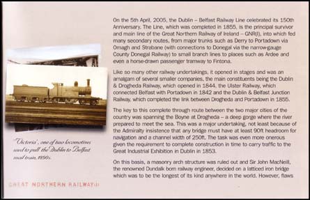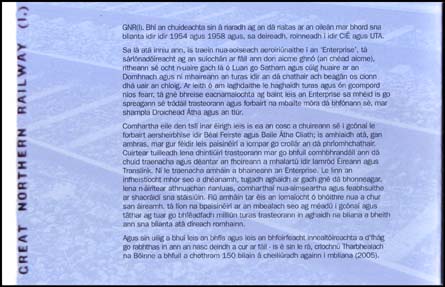 Back page of 1st interleaf First part of history of Dublin-Belfast Railway in Gaelic; railway tracks in background Click on the page to enlarge it |