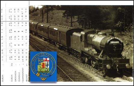 Booklet cover Black and white photos of passenger train at station and Boyne Viaduct in Drogheda; “Dundalk” plaque and program of Bangor to Belfats excursions; in background, morning southbound Enterprise train crossing the low viaduct near Malahide. At the head of the train is S Class 4-4-0 steam locomotive no. 170, “Errigal”, paired with a D1 type 3500 gallon tender Click on the cover to enlarge it |