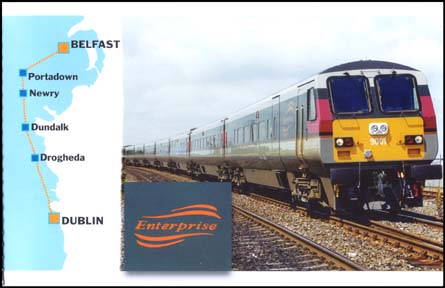 Front page of 1st interleaf Map of Dublin-Belfast line; modern “ Enterprise” passenger diesel trainset and logo Click on the page to enlarge it |