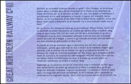 Back page of 3rd interleaf Third part of history of Dublin-Belfast Railway in Gaelic; railway tracks in background Click on the page to enlarge it |