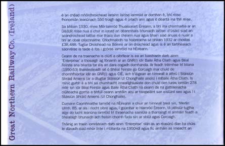 Back page of 2nd interleaf Second part of history of Dublin-Belfast Railway in Gaelic; railway tracks in background Click on the page to enlarge it |