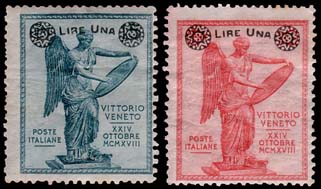 6th anniversary of the victory on the Piave: stamps of 1921 overprinted “LIRE UNA” in black